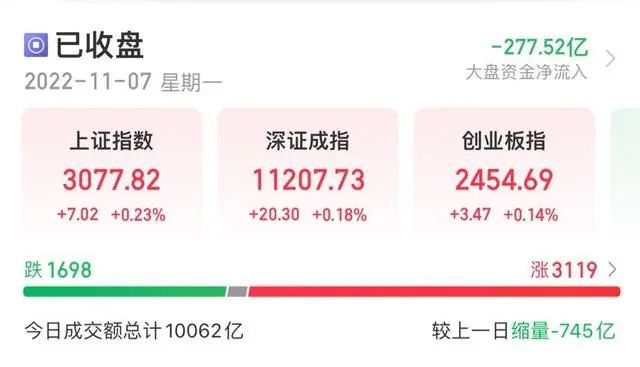 11月7日,A股三大指数全天震荡,截至收盘,沪指涨0.23%,深成指涨0.18%,创业板指涨0.14%,沪深两市全天成交额10062亿元。两市超3100只个股上涨,北向资金全天净卖出40.32亿元。