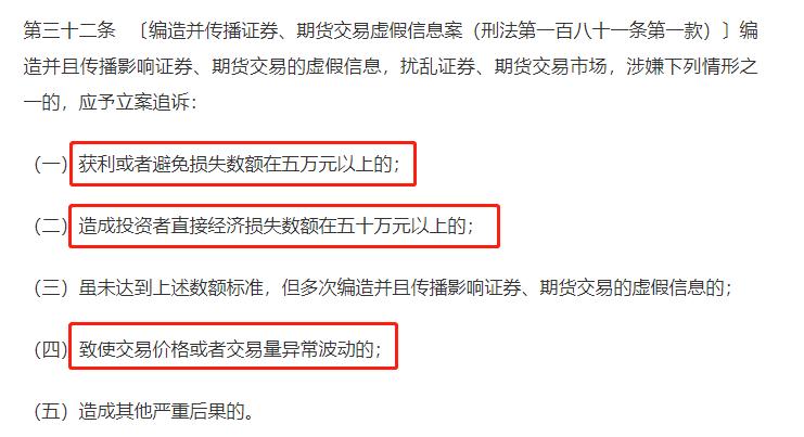 此外,《刑法》第一百八十一条第一款规定,编造并且传播影响证券、期货交易的虚假信息,扰乱证券、期货交易市场,造成严重后果的,处五年以下有期徒刑或者拘役,并处或者单处一万元以上十万元以下罚金。