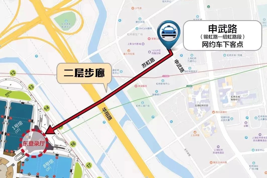 建议线路:从申武路(网约车下客点)出发,登上二层步廊,沿二层步廊继续向西步行,最终到达国家会展中心东登录厅。步行时间:15分钟左右