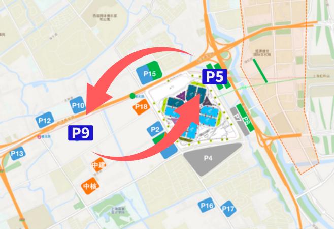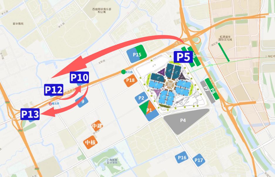 停车场到馆观众乘大巴、自驾小车到达停车场后,P1、P2等近端停车场可步行到馆,远端停车场可通过停车场接驳线至P5、P8后再步行抵达国家会展中心。