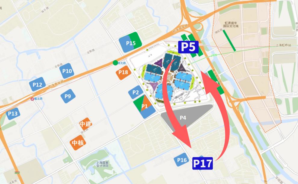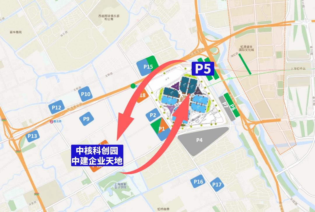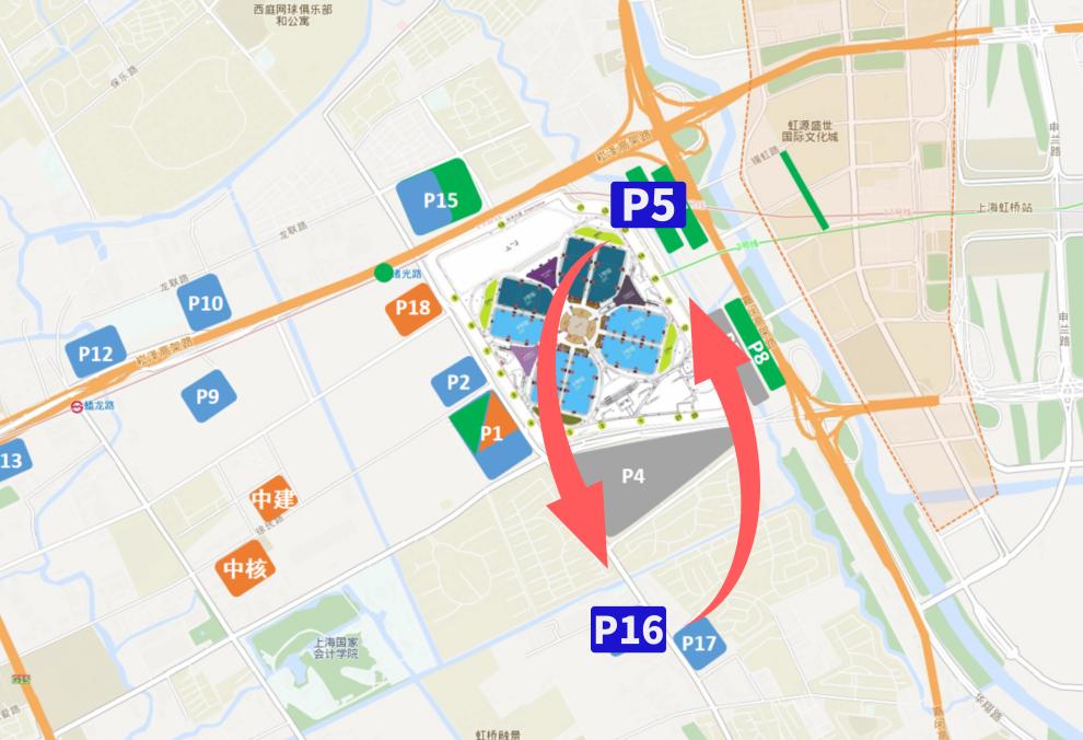 绿线为P8停车场 — 虹桥商务区(南区)停车场原标题:《如何快速抵离国家会展中心?第五届进博会出租、停车场最全交通攻略来啦!》