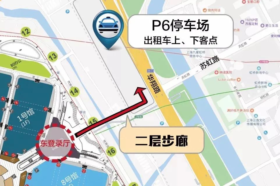 建议线路:从国家会展中心东登录厅出发,沿二层步廊向东步行,至P6停车场下楼梯,到达出租车乘客排队区候车。步行时间:8分钟左右