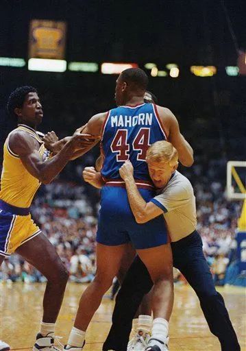 作为当值主裁,杰斯-柯西眼疾手快,挡在两个彪形大汉之间,试图制止这场斗殴,然而他只有5尺10寸,只能死死搂住奥拉朱旺的腰部,任凭两人的拳头在头上虎虎生风。不过很快,柯西以难以想象的力量将大梦推到了湖人替补席附近,马库斯-卢卡斯从身后锁住大梦的脖子,将他顺势拉倒,双方球员一拥而上,场面陷入混乱。