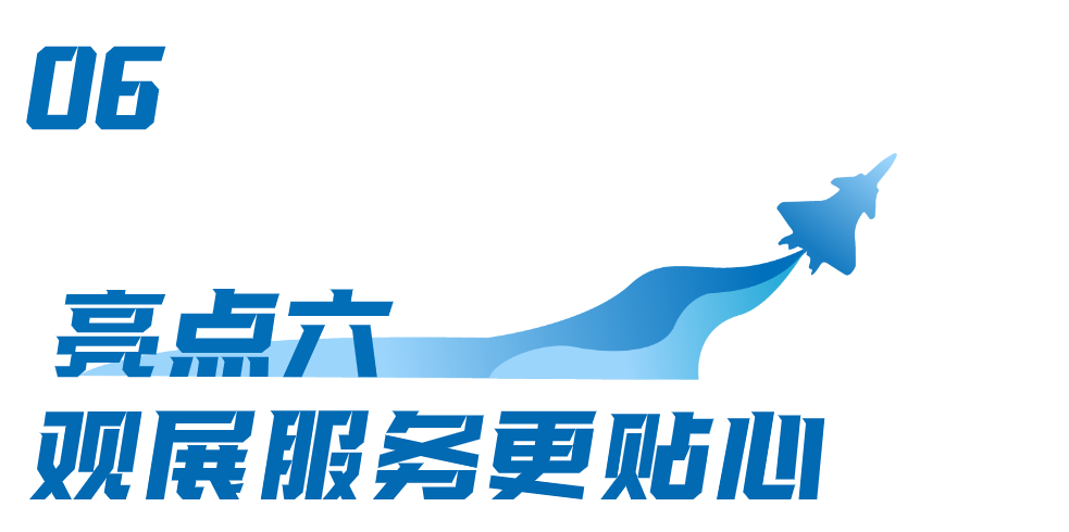 为了给观众提供更好的观展体验,本届航展在公共空间设置了观众休息区;并在草坪设置休闲用餐区,增加遮阳设施,让观众在休闲舒适的过程中观看飞行表演;在展区内开通免费穿梭车,为展商和公众提供更便利出行服务。