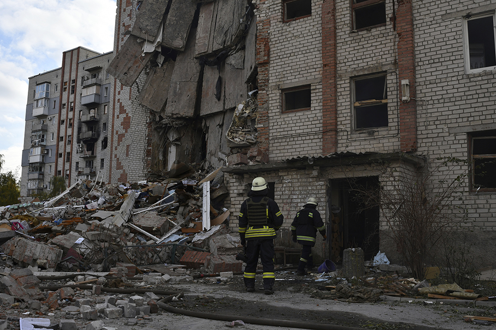 当地时间2022年11月7日,顿涅茨克地区,消防队员在被毁的居民楼现场工作。人民视觉 图
