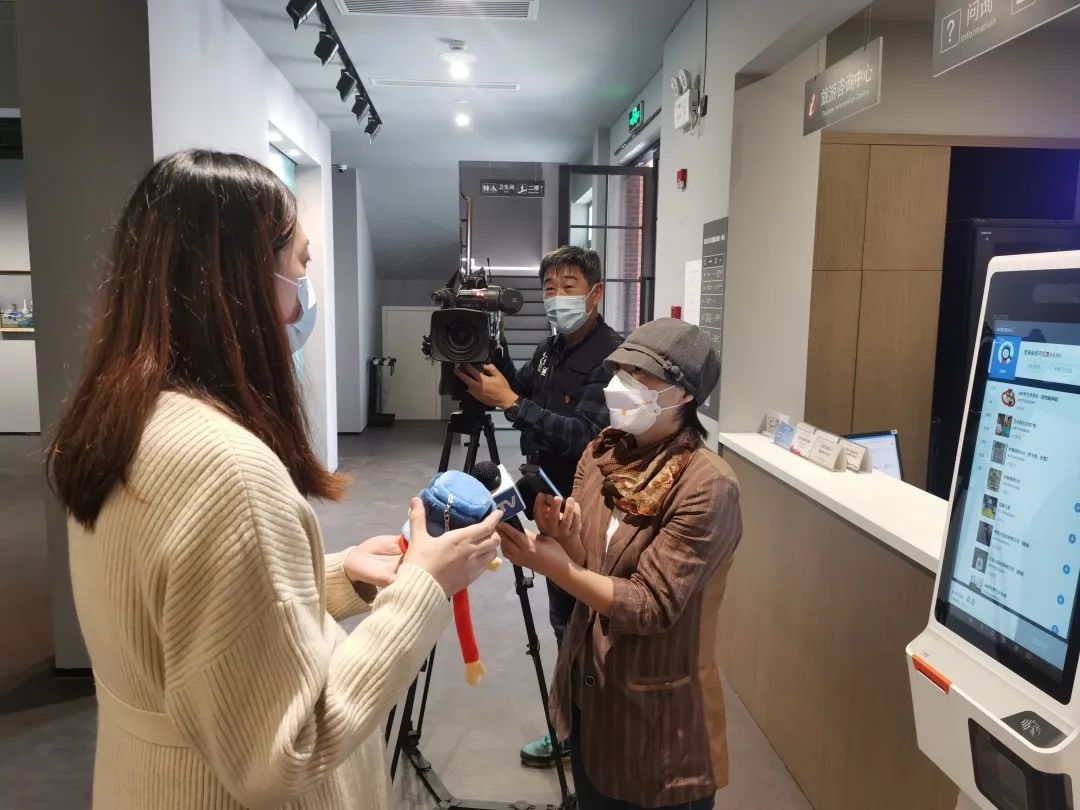 在徐汇艺术馆内,记者张文菁、王卫民对徐汇艺术馆和上海市精神卫生中心联名款实体玩偶“抱抱脑洞”的线下开售活动进行采访。