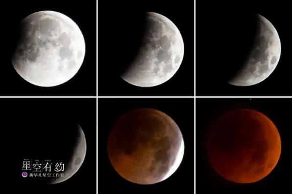 这是2018年7月28日在四川甘孜县拍摄的月全食过程(拼版照片)。新华社记者沈伯韩 摄