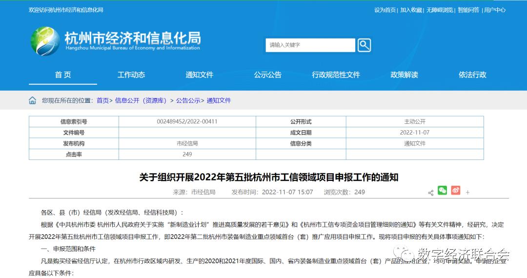原标题:《杭州市经信局关于组织开展2022年第五批杭州市工信领域项目申报工作的通知》