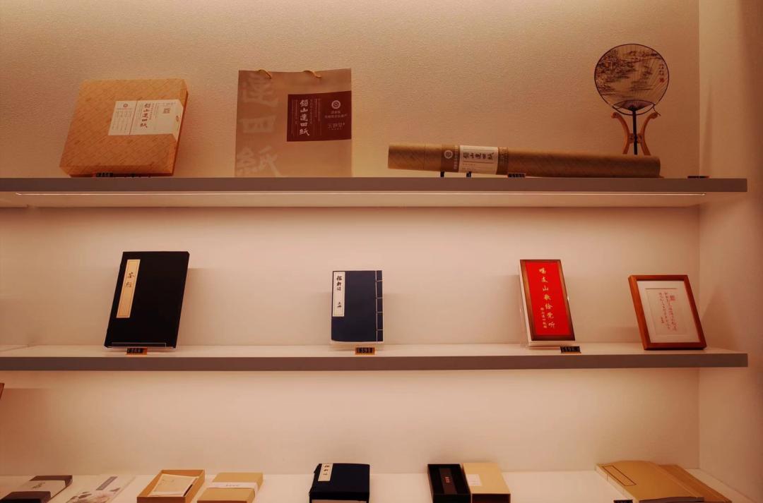 在一层大厅,专题陈列着连四纸相关的工艺产品,包括背包、笔袋、杯碗,以及以连四纸工艺制作的古籍本,如茶经、碑帖等,翻开一页,历史的千年足迹就在手中缓缓展开,有人问,为什么要看重传承?因为这是唯一能与古人神交的时空隧道。