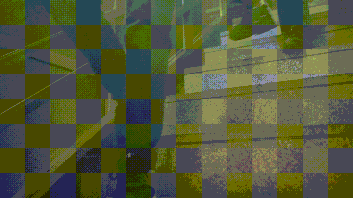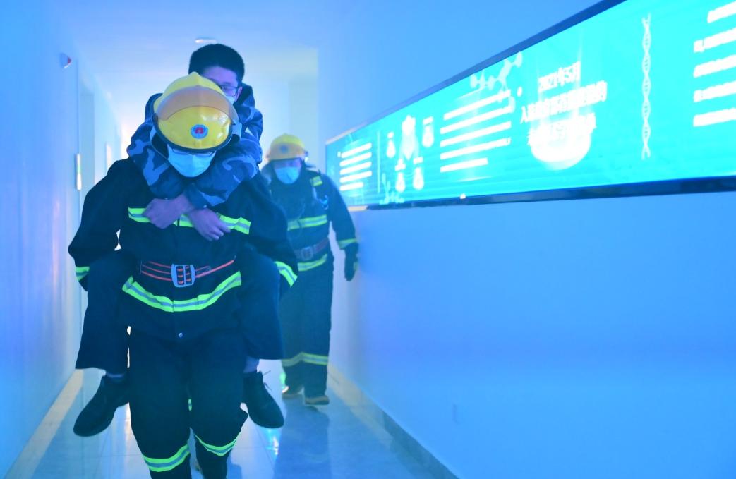 在模拟烟雾逃生体验馆捂住口鼻、弯腰行走
