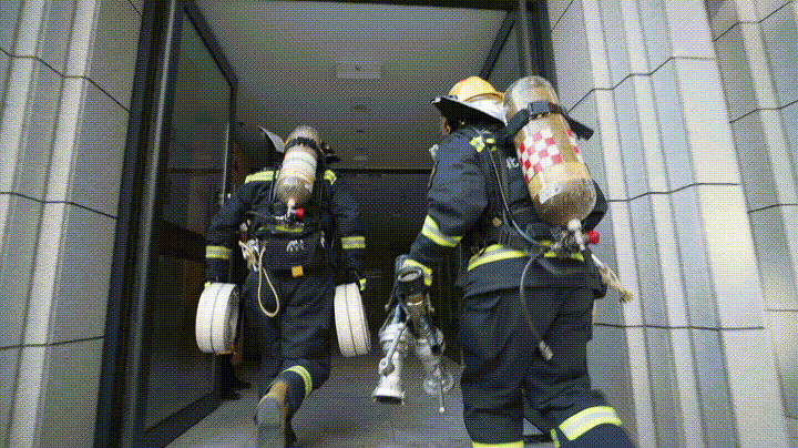 2名消防队员做好个人防护后携带救生通讯绳、担架等救助器材