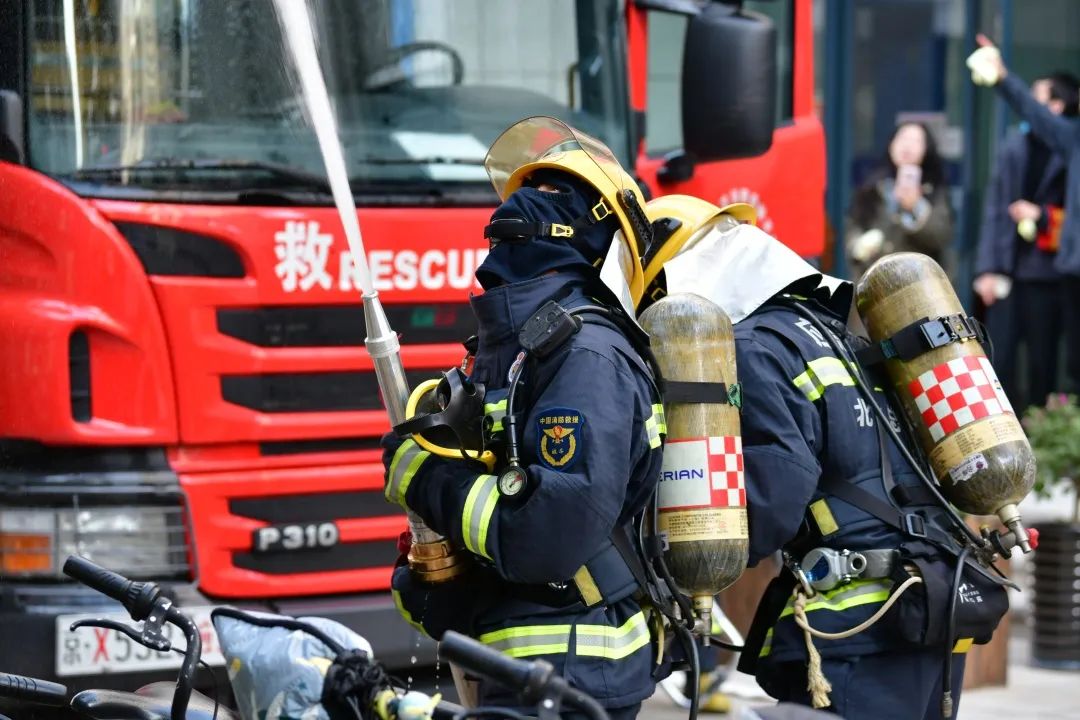 此时,消防救援站也火速抵达现场实施救援云梯消防车、雷诺泡沫车行驶在前面