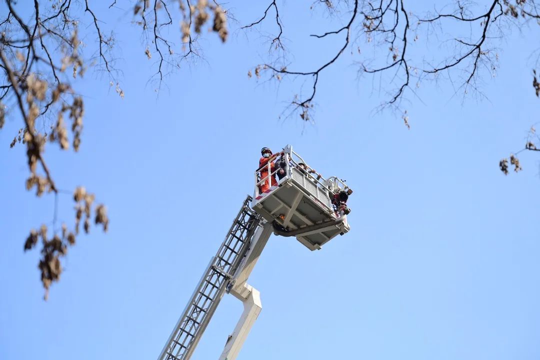 被困在高层平台上的人员在消防员的帮助下成功登上云梯车