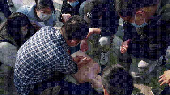 在急救安全区驻足观看医护人员演示人工心肺复苏