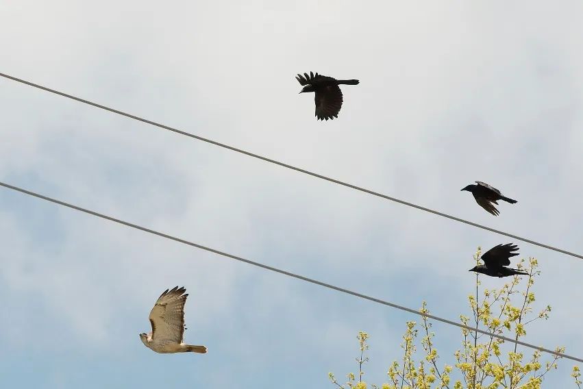 短嘴鸦围攻红尾鵟。图片来源:wikipedia一类是鸟类在看到空中的捕食者后,发出特定频率的叫声,告诉自己的同类危险来了,该逃跑了。至于是发出哪种警报,这就取决于掠食者能不能靠人海战术来战而胜之了。