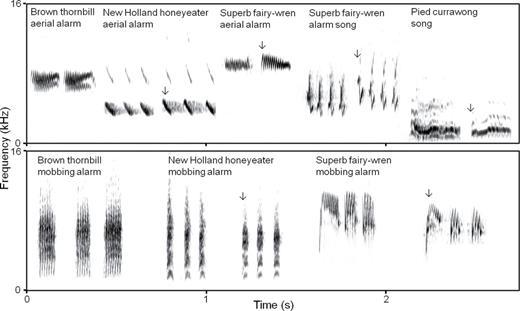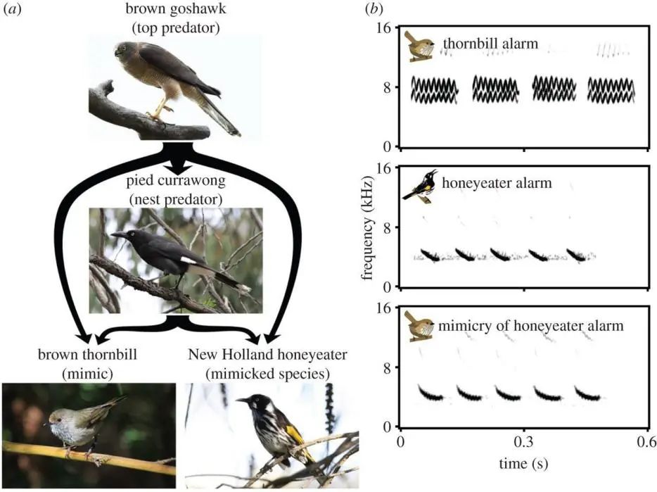 四个物种间的捕食关系以及褐刺嘴莺和黄翅澳蜜鸟的警报鸣叫。图片来源:参考文献不过,褐刺嘴莺的模仿能力可不仅限于这一种,它们同样可以模仿其他鸟类的围攻警报,招来强援,击退敌人。