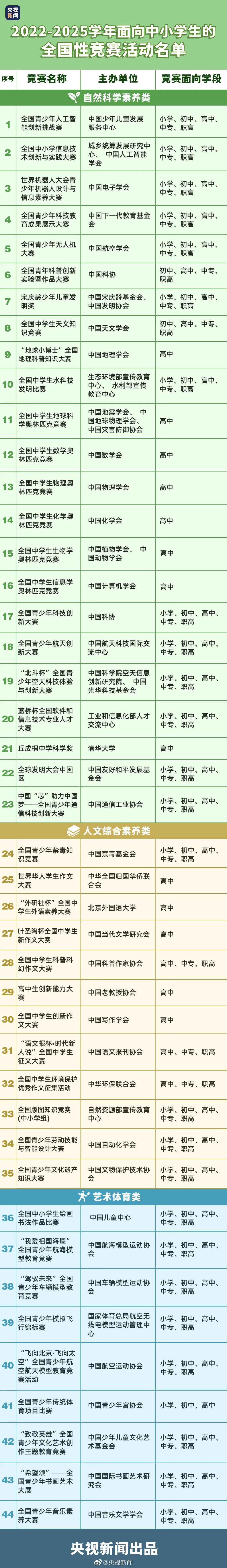▲近期,教育部指导地方接连查处了多起面向中小学生的违规竞赛。“奥林匹克英语大赛”“希望数学”“JEA China”,以及所谓的数学花园探秘、华数之星、五羊杯、走美杯、美国大联盟、卓越360统测、全英赛、世奥赛等均未列入教育部公布的“面向中小学生的全国性竞赛活动名单”,均属违规竞赛。提醒:凡是未列入“面向中小学生的全国性竞赛活动名单(见下图)”的均是违规竞赛。