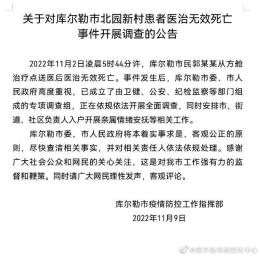 ▲库尔勒市融媒体中心11月9日消息,11月2日凌晨5时44分许,库尔勒市民郭某某从方舱治疗点送医后医治无效死亡。事件发生后,库尔勒市委、市人民政府高度重视,已成立了由卫健、公安、纪检监察等部门组成的专项调查组,正在依规依法开展全面调查,同时安排市、街道、社区负责人入户开展亲属情绪安抚等相关工作。库尔勒市委、市人民政府将本着实事求是、客观公正的原则,尽快查清相关事实,并对相关责任人依法依规处理。