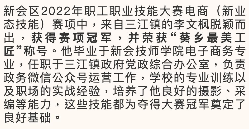 新会技师学院电子商务专业一直坚守科教育人的初心,培养贴近本地产业需求的电子商务专业复合型人才。依托新会区农村电商产业园,联动政校行企,创新人才培养模式,融“教、学、赛、做”为一体,促进电子商务高技能人才的培养,切实助力人才倍增。