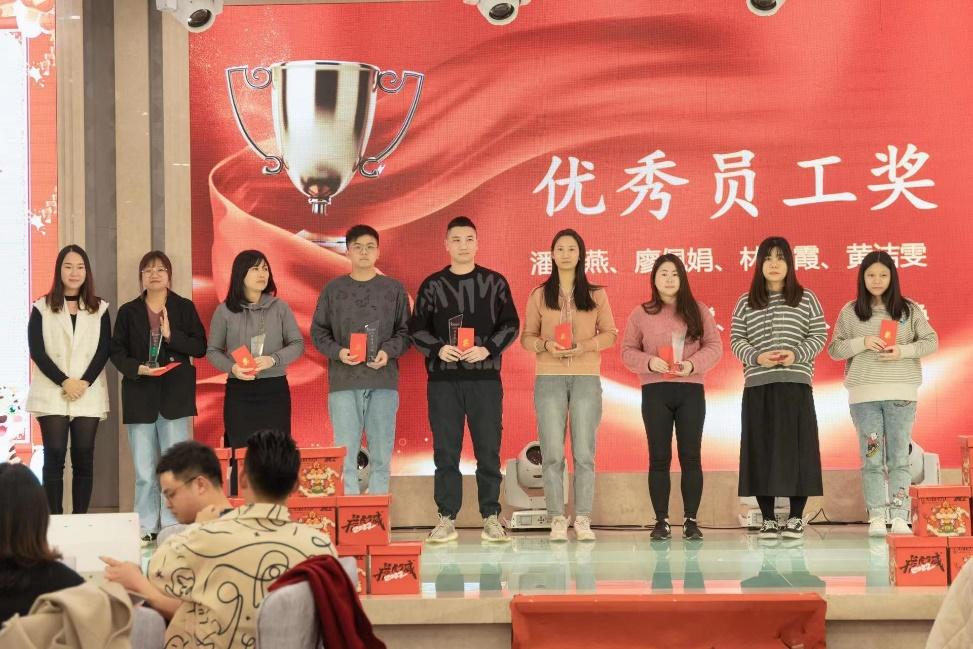 ▲获企业优秀员工奖(左四)入职江门市羽宙商贸有限公司后,炳瑶从一开始的“小白”实习生,到业务熟练的网店店长,他不但熟悉仓库各个岗位工作流程,还担任售前客服,接待淘系和京东平台客户等工作,得到企业的高度评价,获得企业优秀员工奖。