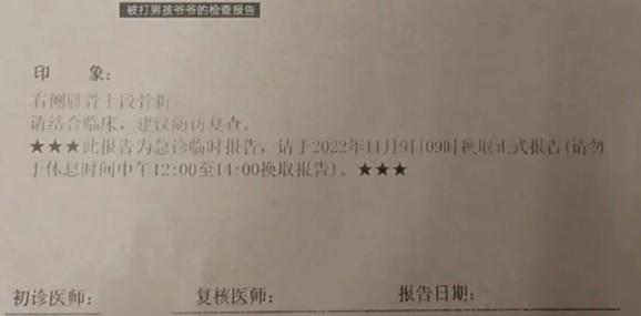 另一份孩子爷爷在该院的检查报告单显示,其右侧腓骨上段见多条骨折线,断端对位尚可。报告单印象为“右侧腓骨上段骨折”。