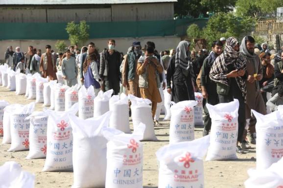 ▲ 2022年4月23日,阿富汗民众在喀布尔排队领取中国援助的粮食。根据《新时代的中国国际发展合作》白皮书等公开资料显示,2016年以来,中国连续向亚非拉50余国提供紧急粮食援助。新冠肺炎疫情发生以来,中国通过双多边渠道向阿富汗、斯里兰卡、肯尼亚、乌干达、刚果(布)、贝宁、利比里亚等国提供紧急粮食援助。
