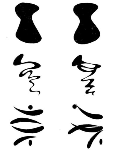 这样的量表长什么样呢?举个例子,1979 年的时候,心理学家就编订过一个视觉美学量表,这个量表包含许多四十二对图片,一幅是专家评估更有艺术性的图案,另一幅是改变了外形的同一个图案,请测试的人判断,哪一幅更美。这些心理学家认为,一个人要是能分辨两种图片,自然说明审美水平更高[3]。