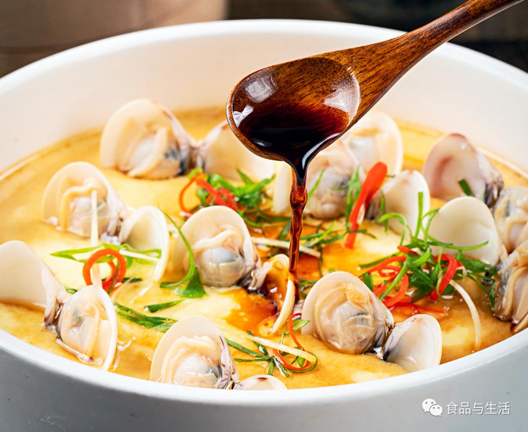 还可以用各种海鲜蒸蛋,最常见的就是文蛤蒸蛋,文蛤也可以换成蛏子、鲍鱼、扇贝肉、墨鱼蛋等等,做法大同小异,都是等鸡蛋蒸得半熟,再把汆烫熟的海鲜码在表面,再蒸几分钟,起锅浇一点蒸鱼豉油,撒上葱花,淋一点熟油就可以上桌。