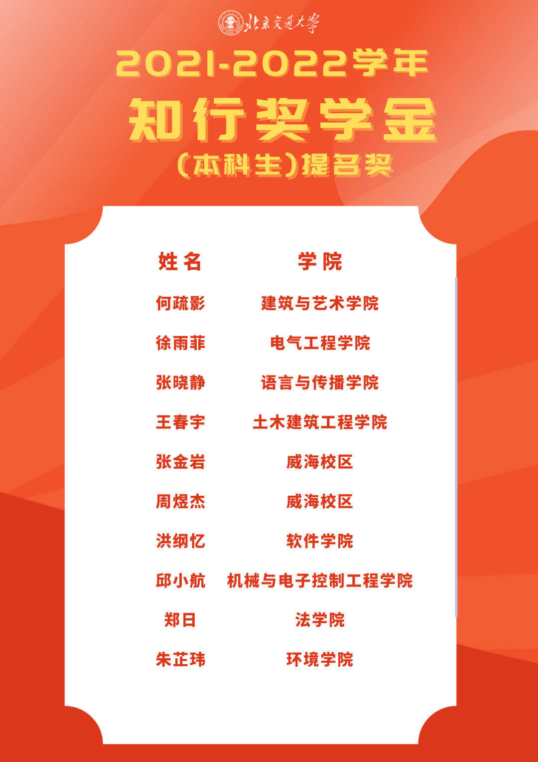 本学年“知行奖学金(本科生)”评选工作于2022年10月24日正式启动,各学院按照公布评选通知、学生自愿申报、学院资格审查、民主测评、拟定人选并公示的程序对本学院学生进行了遴选,共推荐出31名学生报送学生工作处。11月1日,知行奖学金(本科生)评审委员会召开评审会议,从推荐者中评选产生了20名候选人。前期,学校对20名候选人进行了公开风采展示,并依托微信平台“北京交通大学Vke”开展了网上投票。