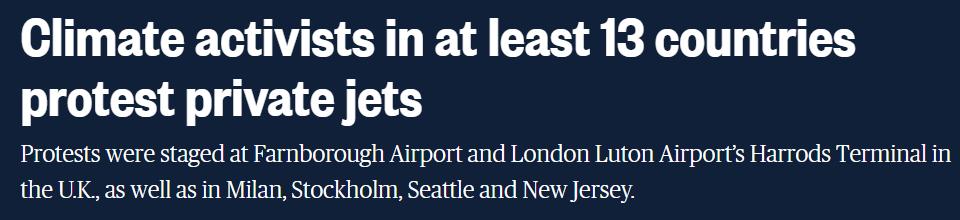 美国全国广播公司(NBC News)报道截图根据这些环保团体及媒体在推特上发布的现场视频及照片,抗议者在英国范堡罗机场和伦敦卢顿机场拉横幅堵住了机场的道路,呼吁“对经常坐飞机的人征税”、“禁用私人飞机”。