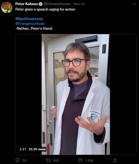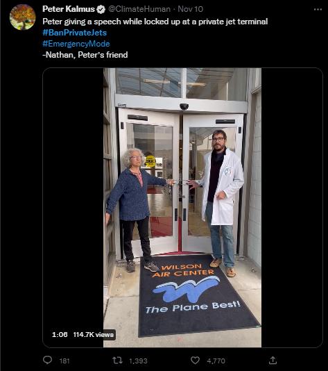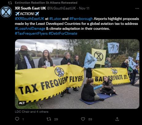 英国范堡罗机场的气候活动人士,图自推特(下同)据美国全国广播公司(NBC News)11月11日报道,来自欧洲和美国的气候活动人士10日各自封锁了他们国家的部分机场,以批评航空业的碳排放,呼吁禁止使用私人飞机。