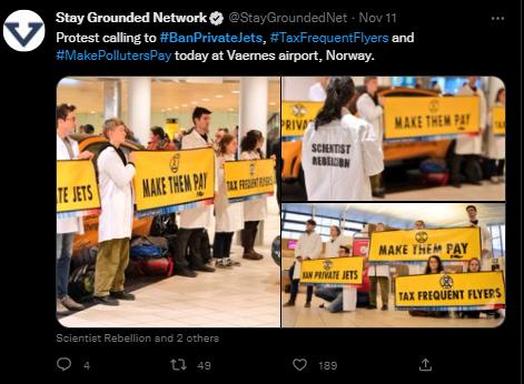 11月10日,挪威特隆赫姆国际机场抗议者。美国全国广播公司称,活动人士瞄准私人飞机,是因为它们代表了超级富豪及其生活方式对全球温室气体排放的典型的“贡献”。