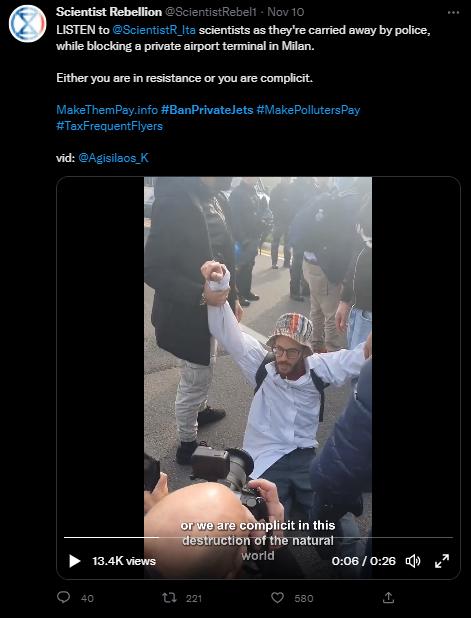 《纽约时报》10日报道,活动人士表示,有十几名抗议者(包括一名科学家)当天在美国的私人机场抗议时被拘捕,原因是擅自闯入、干扰公共交通等。意大利米兰等地也发生了类似的拘捕事件。
