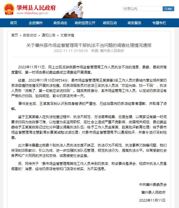 昨晚(11月11日),肇州县政府官网发布通报称,县市场监督管理局王某某已向奶茶店经营者道歉,并取得谅解。