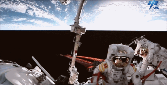 神舟十四号航天员出舱活动,宇航员的头盔上有黄金薄膜。图片来源:中国载人航天