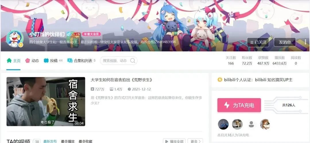 今年1月16日,他们获得了b站CEO寄来的祝贺信,庆祝他们的账号“小叮当的伙伴们”获得首个十万粉丝。两天前,他们以“室友矛盾”为主题创作的《宿舍保卫战》也将视频的平均观看率稳定在了40万以上。