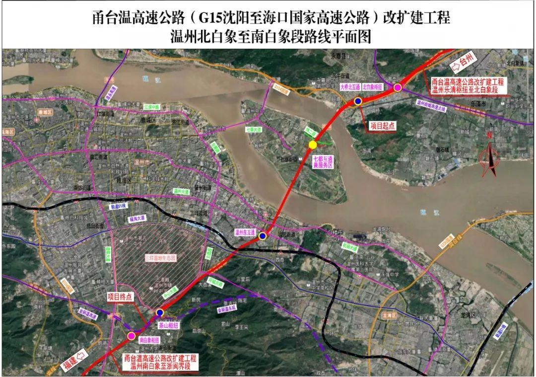 项目起于乐清市北白象镇,甬台温高速公路大桥北互通处,接甬台温高速公路改扩建工程温州乐清枢纽至北白象段,沿线经乐清市、永嘉县、鹿城区、龙湾区和瓯海区5个县(市、区),终于瓯海区茶山街道,甬台温高速公路南白象枢纽北侧,接甬台温高速公路改扩建工程温州南白象至浙闽界段。路线全长约14.73公里;设互通式立体交叉4处;互通收费站3处;增设服务区1处(与七都互通合建),以及配置必要的交通辅助管理用房和设施。项目总体采用双向八车道高速公路标准,设计速度100公里/小时,整体式路基宽度41米;局部采用两侧分离新建三车道方案,与既有高速形成“3+2+2+3”的十车道断面,计划建设工期48个月。