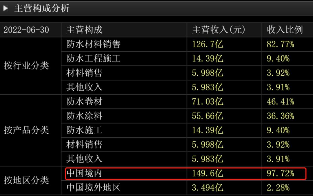 目前的东方雨虹,国内业务带来的收入比例高达近98%,海外业务能不能拓展起来存在很大疑问。