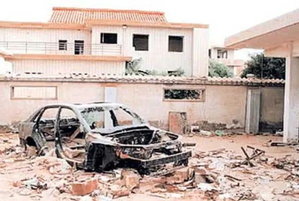 使馆内被纵火烧毁的汽车杨洪林:战后伊拉克生活条件非常艰苦,由于原使馆遭武装洗劫,全部财产被抢光,使馆结构严重受损,已无法办公和居住。