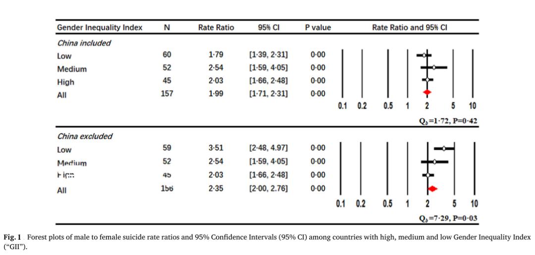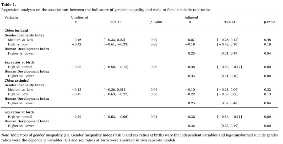 方法:文章采用2012年世界卫生组织统计信息系统的自杀数据来计算自杀性别比,并利用森林图来评估性别不平等(由GII和出生性别比表示)是否调节了全球自杀性别比,最后进行回归分析,以估算在控制HDI前后,性别不平等对自杀性别比的影响程度。