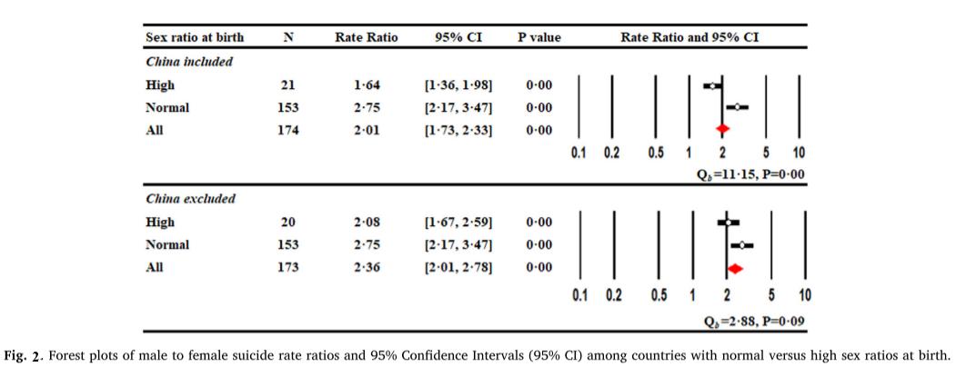对比出生性别比正常的国家与出生性别比偏高的国家 (见Fig.2),出生性别比高的国家的自杀性别比明显更低(1.64:2.75,P= 0.00)。排除中国的分析(Fig.2的下部) 仍然揭示了这种模式,尽管程度较小 (2.08 vs. 2.75,P = 0.09)。