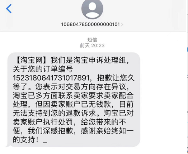 彭先生说,他意识到自己被骗后联系了淘宝客服,对方回复称,已将该情况上报反馈给相关部门,相关部门回复称:因订单交易关闭,开不了入口,平台建议消费者联系商家处理。