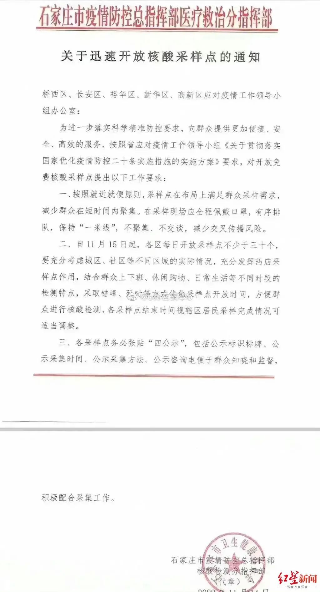 网上流传的一张疑似由石家庄市疫情防控总指挥部核酸检测分指挥部下发的“关于迅速开放核酸采样点的通知”要求,桥西区、裕华区、新华区、长安区、高新区自11月15日起,各区每日开放采样点不少于30个,充分发挥药店采样点作用,采取错峰、延时等方式优化采样点开放时间,各采样点结束时间视辖区居民采样完成情况可适当调整。各采样点务必公示采集时间。