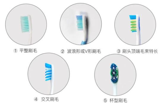 多层次、成角度的刷毛,比传统平整式刷毛去除牙菌斑的效果更好[6]。牙刷的“发型”(刷毛排列形状)非常多,下面这5款比较常见。