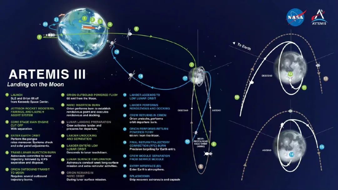 飞船进入绕月轨道后,将与登月舱实施在轨对接,把2名航天员转移到登月舱上并踏上月球表面。预计完成6天多月面探索后,他们将返回绕月轨道并与飞船对接,最终4名航天员乘坐猎户座飞船返回地球。