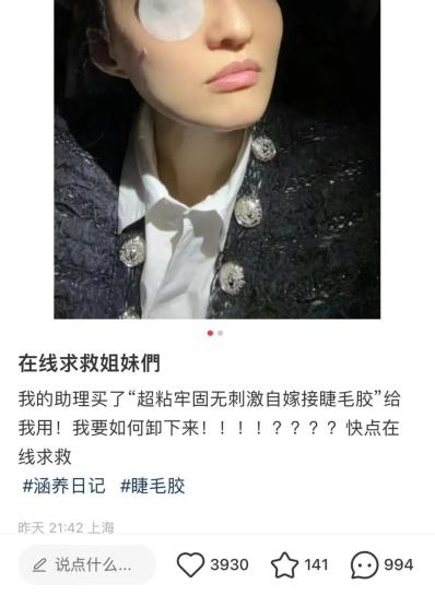 前几天,张韶涵在社交媒体上放出一张卸假睫毛的照片,向网友求助。随后的一则视频里,她解释助理购买了“超粘牢固无刺激自嫁接睫毛胶”,但从杭州坐到了上海也没卸掉。