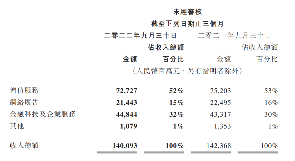 财报显示,腾讯在今年三季度销售及市场推广开支同比下降32%至71亿元。增值服务业务收入成本同比下降1%至351亿元,网络广告业务成本同比下降5%至115亿元,金融科技及企业服务业务成本同比下降3%至299亿元。