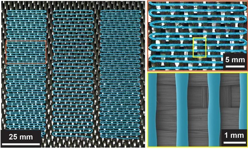 研究小组通过在增强材料上3D打印热塑性愈合剂图案来解决这个问题。研究人员还在复合材料中嵌入了薄“加热器”层。当施加电流时,加热器层升温,从而熔化愈合剂,而该愈合剂会流入复合材料内的裂缝或微裂缝中并对其进行修复。