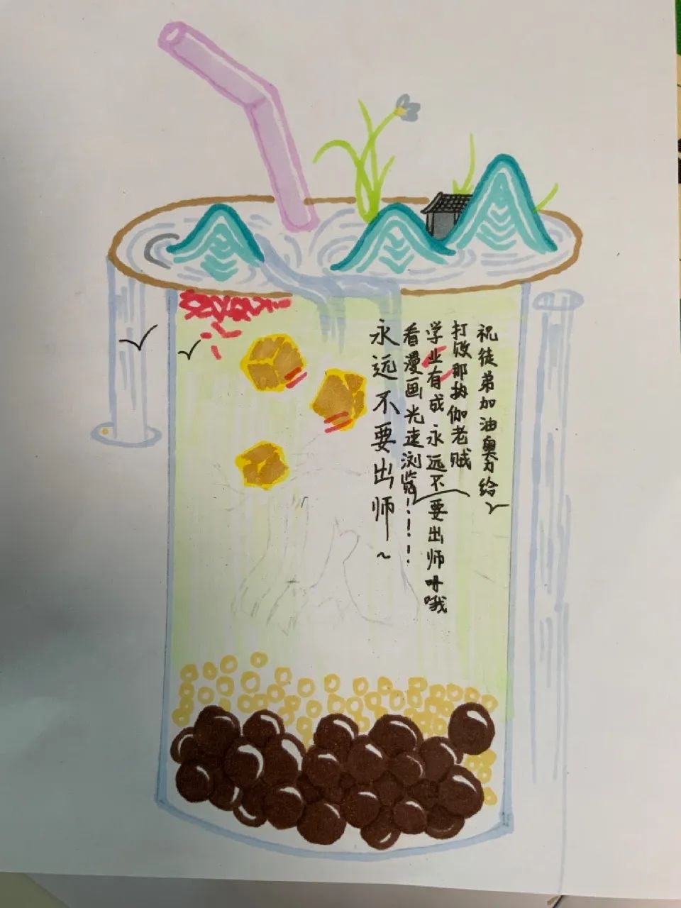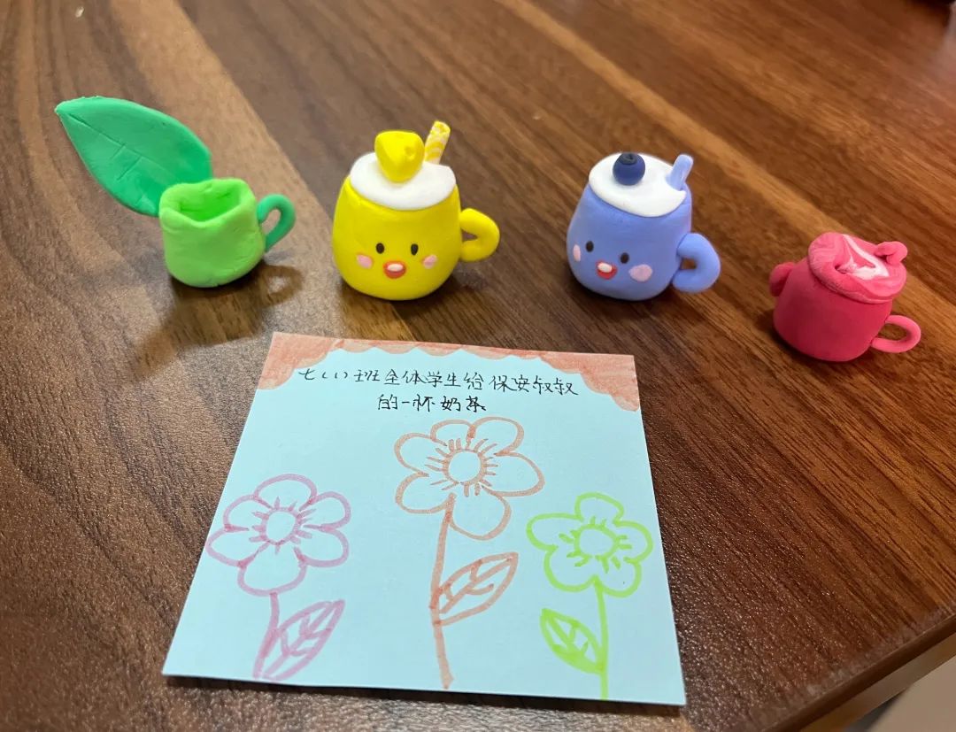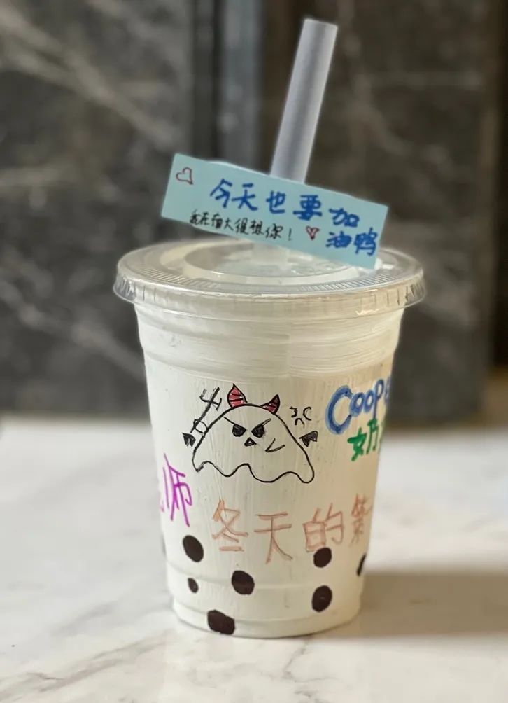 晨光熹微时,大家在他们的温暖守候中入校;暮色降临时,大家伴着他们的暖心道别离开。正是他们的默默守护,大家才能每天平安快乐地在校园里生活和学习。于是她们决定制作一套奶茶杯,致敬全体保安叔叔,向他们道一声:您辛苦了!
