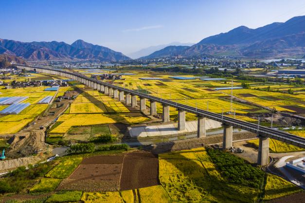 金黄的稻田上,成昆铁路客运复线的铁轨已经铺好,待全线贯通后,冕宁将跨入动车时代文旅之变